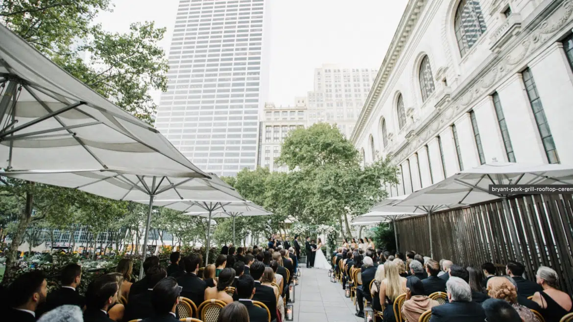 Marisa and James, now Mr. and Mrs. Miller chose the beautiful New York City wedding venue Bryant Park Grill located in heart of Manhattan. The Parisian-style dining with the backdrop of the iconic landmark of the New York Public Library made for an eclectic venue and reception experience. The beautiful seasonal patio and roof dining truly made every guest feel like they were on top of the world in the city that never sleeps!