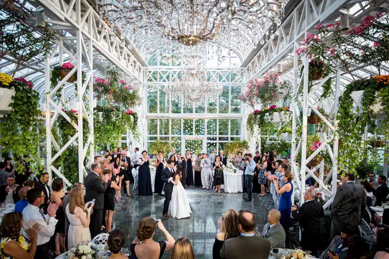 When the doors opened to the Glynallyn Ballroom, guests were transported into an extravagant 4,000-square-foot conservatory. The spacious ballroom had magnificent chandeliers emit warm ambient lighting, which added to the intimate and personal atmosphere. The conservatory also had natural light streaming in through the glass roof, transforming the space into an illuminated oasis!